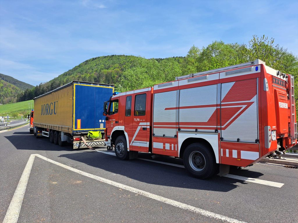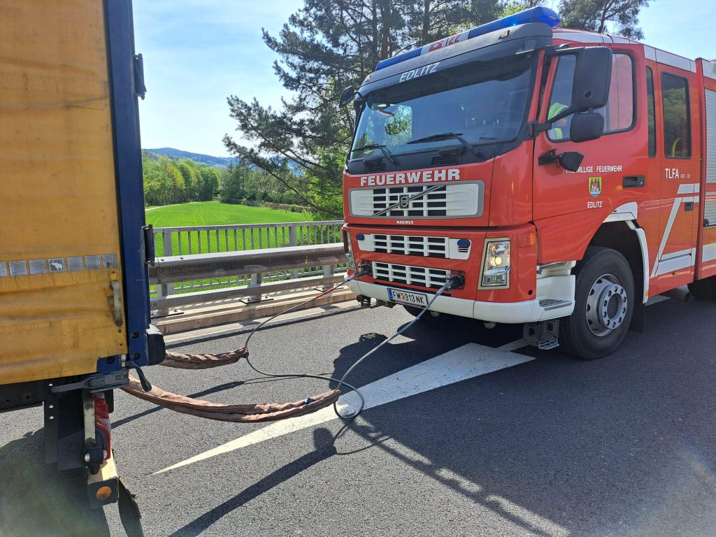 In einer sehr unübersichtlichen Kurve auf der Abfahrtsrampe Grimmenstein kam ein Sattelschlepper aufgrund eines technischen Gebrechens zum Stillstand. Seitens der Feuerwehr Edlitz wurde die Einsatzstelle durch die Mannschaft des KDO Edlitz sofort abgesichert um etwaige Folgeunfälle zu vermeiden. Im Anschluss wurde der defekte LKW mittels RLFA 3000 zu einem nahegelegenen Abstellplatz geschleppt.