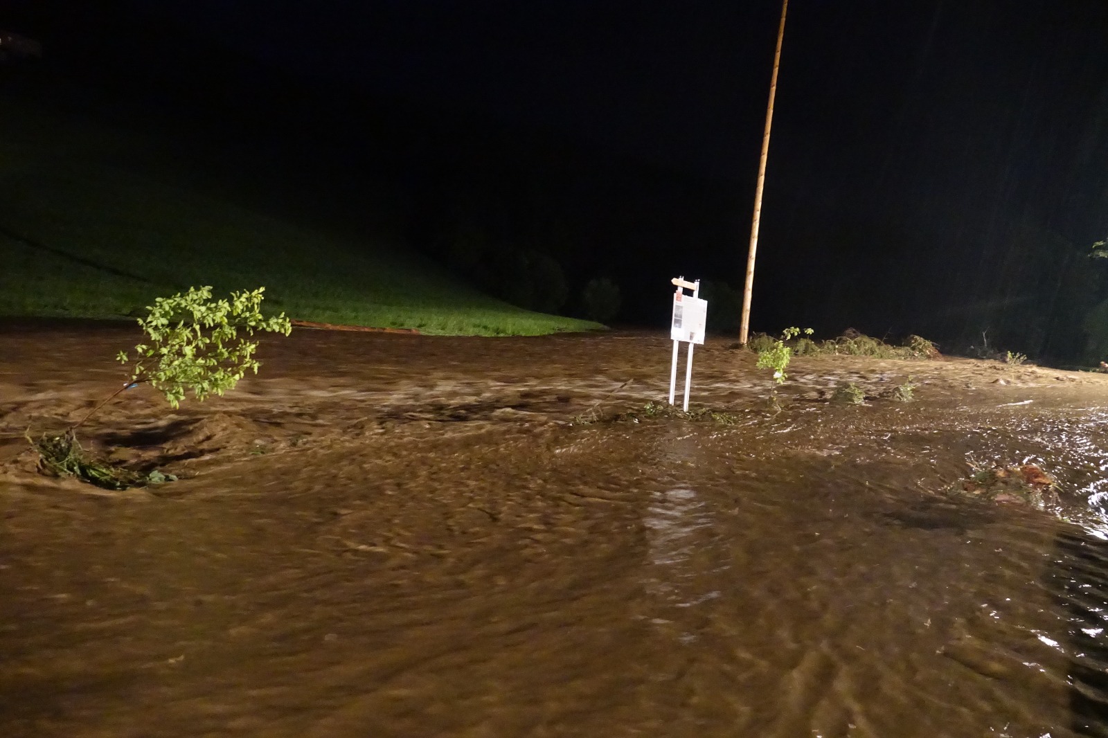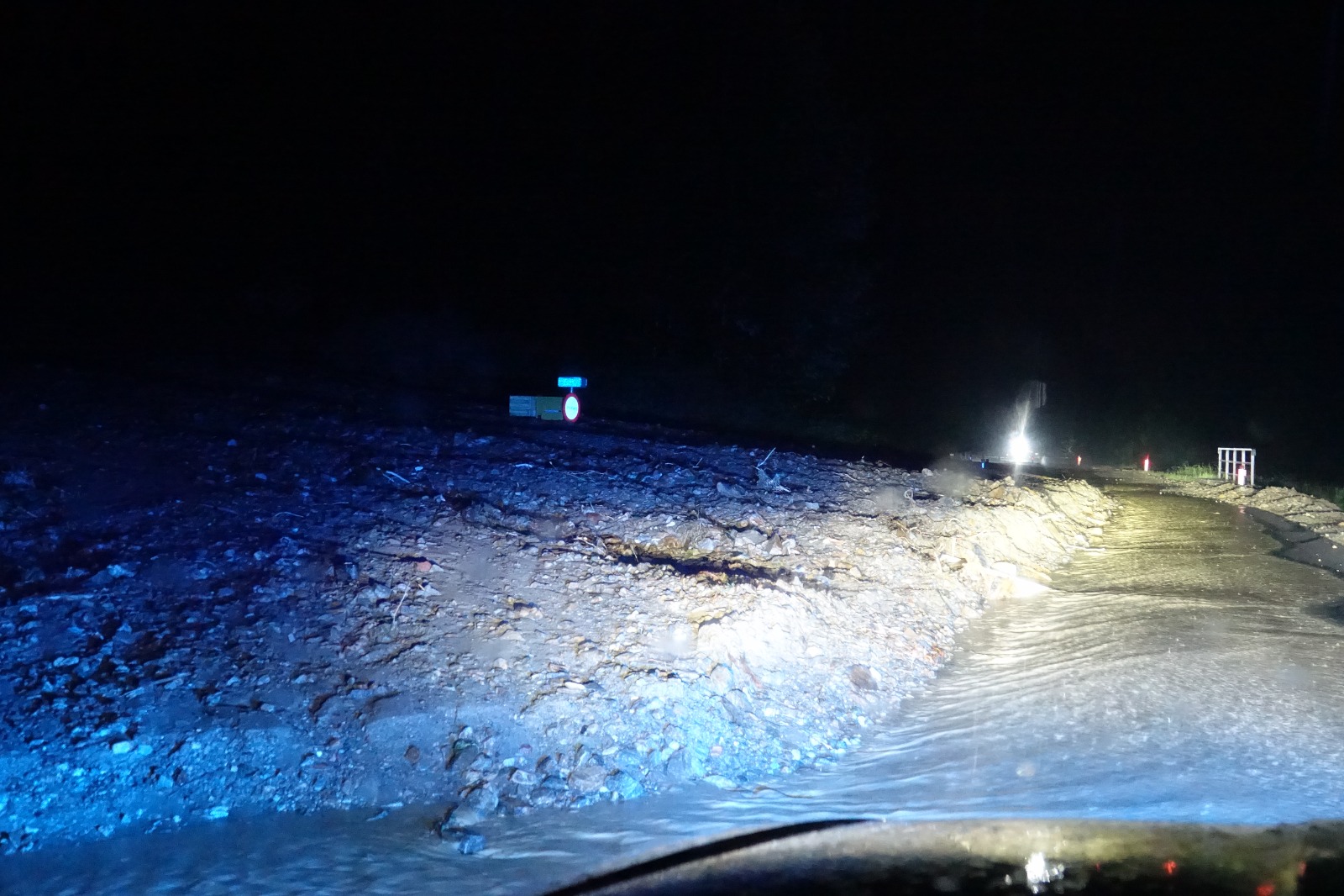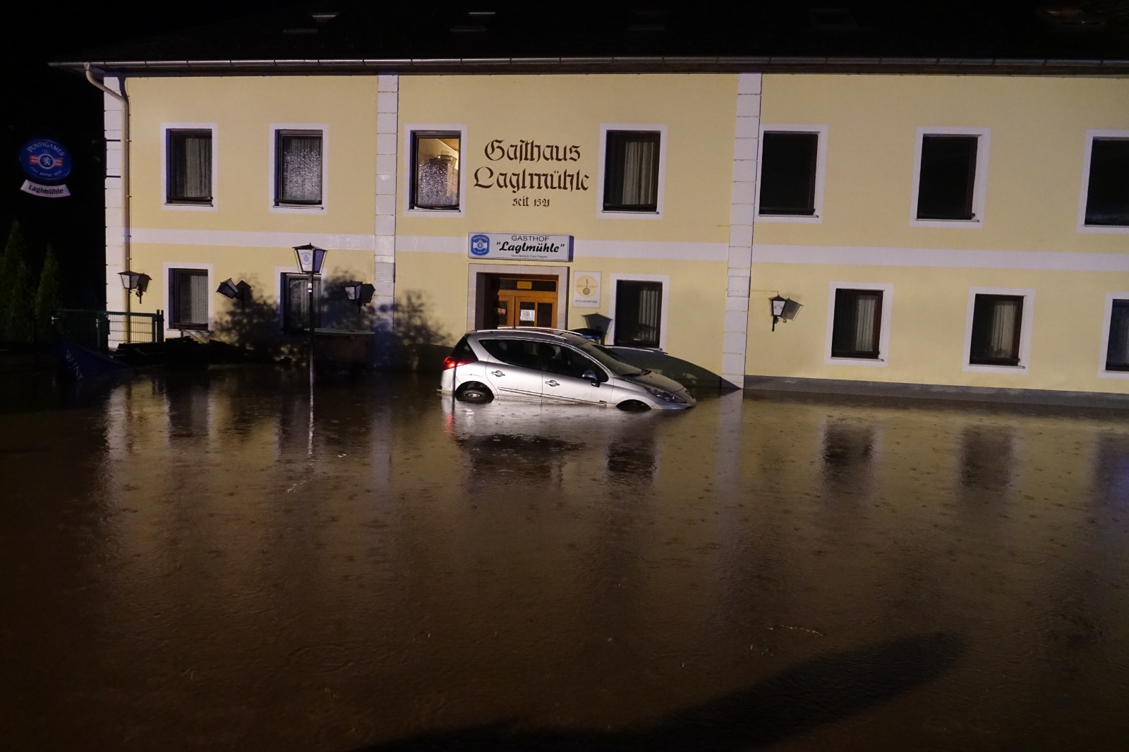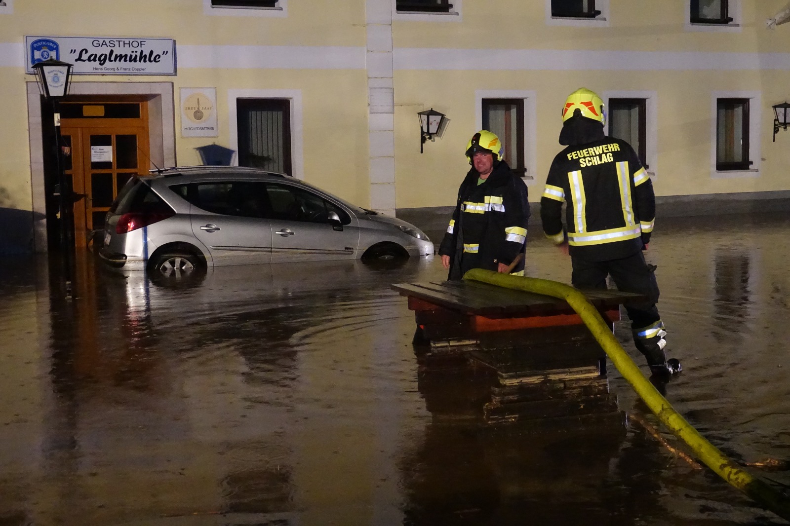 Im Zuge des Katastrophenhilfsdienstes der 15. KHD Bereitschaft wurden wir am Samstagabend gegen 21 Uhr mit Kräften des KHD Zuges 1/15 nach Schäffern alarmiert. Gegen 18 Uhr entlud sich in diesem Bereich des Wechsels ein Unwetter, welches massive Schäden hinterließ. Da die Laglmühle zwischen Schäffern und Elsenau nur mehr von der Seite Schlag aus erreichbar war, wurde diese Strecke gewählt, um in den Einsatzraum zu kommen. Zahlreiche Muren blockierten bis dorthin den Weg, was eine Zufahrt etwas erschwerte. Am Einsatzort angekommen ahnte man bereits was die steirischen Kräfte seit Stunden durchmachen. Der normalerweise kleine Bach neben der Straße, wurde zu einem reißenden Strom und uferte an mehreren Stellen aus. Der Gasthof mit Wasser und Schlamm geflutet.