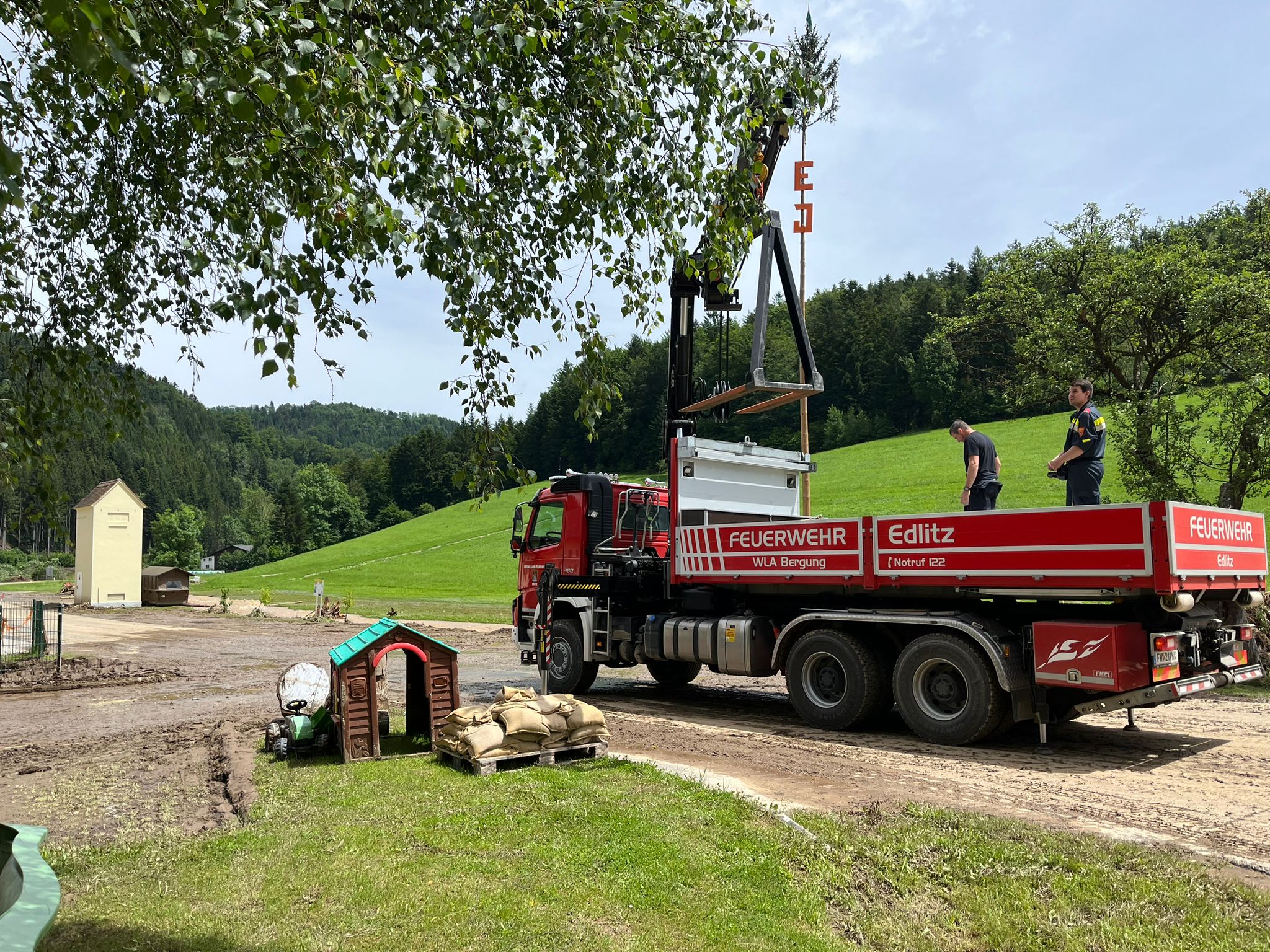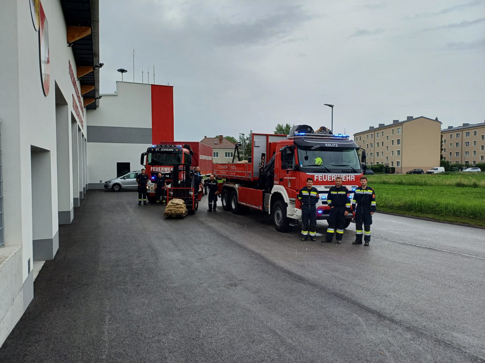 Am gestrigen Vatertag dann eine weitere Alarmierung gegen 8:30 Uhr. Wieder im Zuge des KHD wurden mehrere Wechselladefahrzeuge, darunter auch das WLF Edlitz vom BFV Hartberg angefordert, um Sandsäcke zu den Einsatzhotspots zu transportieren. Drei Mitglieder standen dabei bis 13:45 Uhr im Einsatz.