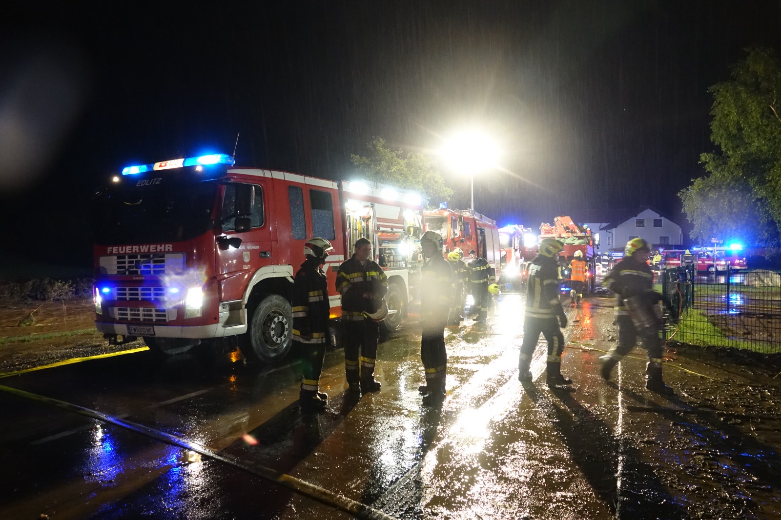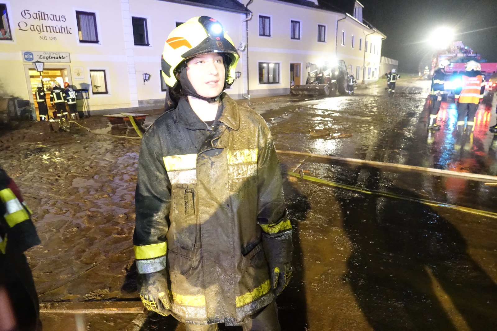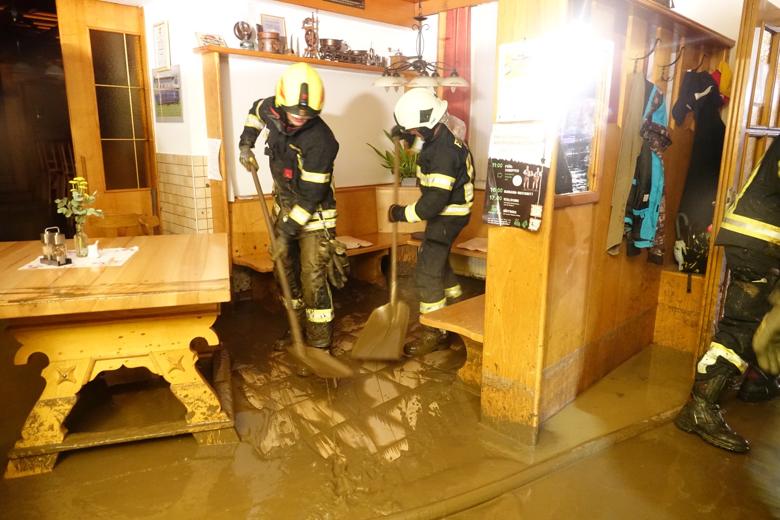 Nach der Einteilung des Zuges ging es ans aufräumen. Der Gasthof wurde in schweißtreibender Arbeit vom Schlamm befreit, bzw. das zerstörte Inventar ins freie gebracht. Gegen 4:30 Uhr konnte der Einsatz für die TLF Besatzung beendet und nach Niederösterreich zurückgekehrt werden.