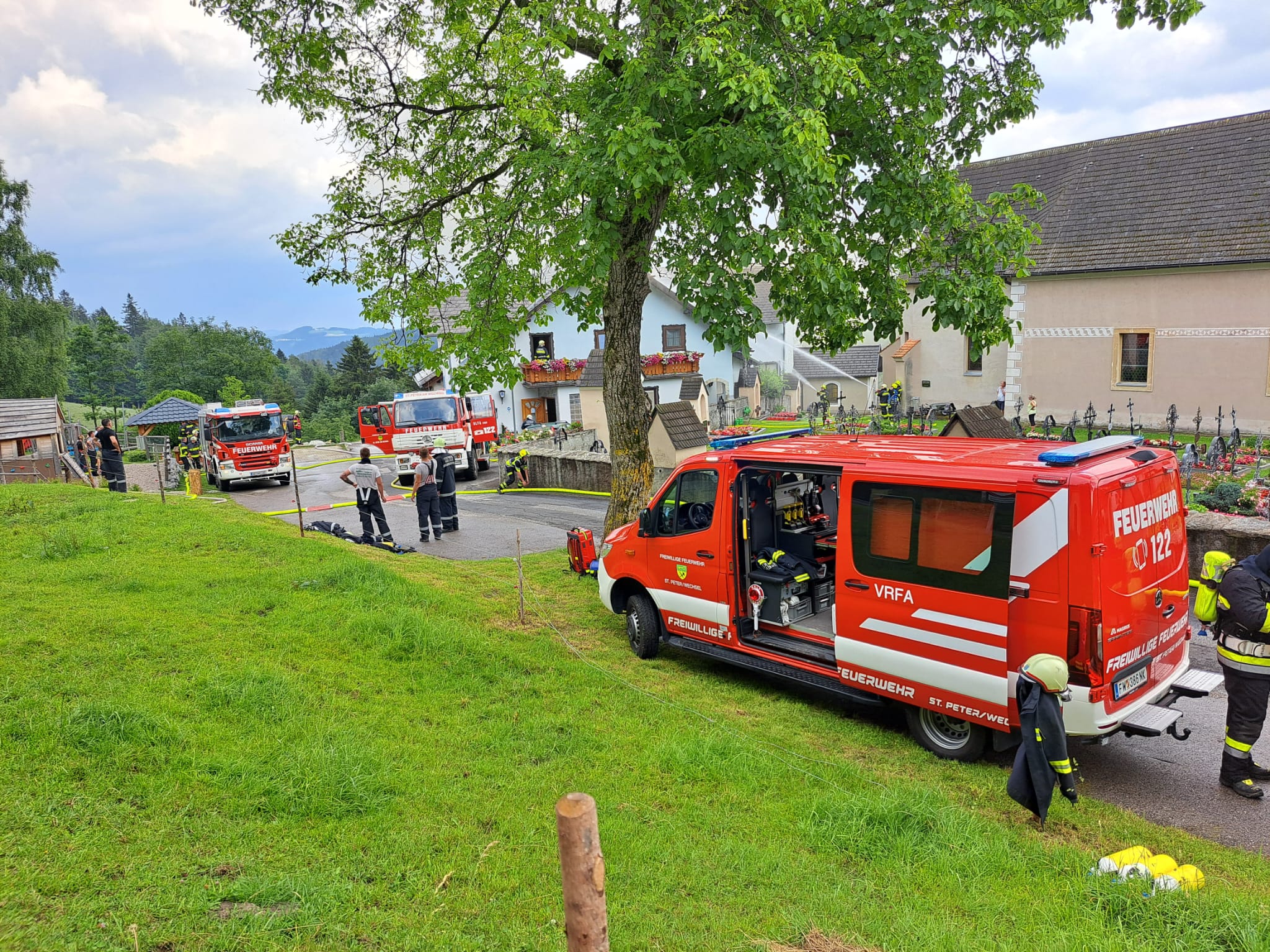 Um 14:49 Uhr wurden wir am heutigen Freitag (28.06.2024) zu einem Brandeinsatz der Alarmstufe 4 nach St. Peter am Wechsel gerufen. Wir rückten mit RLFA-3000 und TLFA-4000 und 14 Mitgliedern zum Einsatz aus. Vor Ort bekämpften bereits 9 Feuerwehren den Brand im Innen und Außen angriff. Unsere Aufgabe bestand darin bei der Wasserversorgung zu unterstützen. Verletzt wurde beim Brand glücklicherweise niemand. Die Brandursache wird von der Polizei ermittelt. Nach rund 1,5 Stunden konnten wir wieder ins Gerätehaus einrücken. Wir bedanken uns bei den eingesetzten Kräften für die gute Zusammenarbeit.