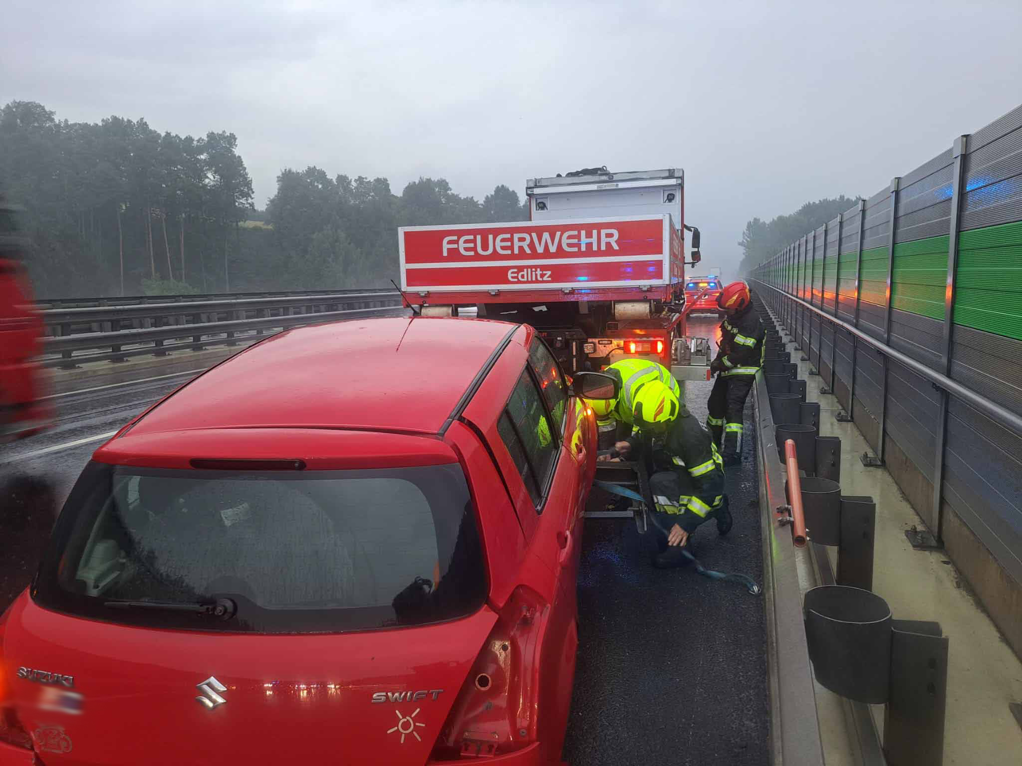 Am Freitag (12.07.2024) wurden wir in den frühen Morgenstunden zu einer Autobahn Fahrzeugbergung auf die A2 Richtung Wien bei km 62 gerufen. Ein Lenker kam mit seinem Pkw auf der regennassen Fahrbahn ins schleudern und prallte gegen die Leitwand. Der Wagen kam folglich schwer beschädigt auf dem Pannenstreifen zum Stillstand. Nach der Absicherung der Einsatzstelle wurde der verunfallte Pkw mittels Hubbrille geborgen und von der A2 verbracht. Wir standen mit VRF, RLFA-3000, WLFK und KDO sowie 12 Mitgliedern im Einsatz. Weiters die Autobahnpolizei Warth sowie der SMD Aspang – Mönichkirchen, welcher den Lenkerin ins LK Wiener Neustadt brachte.