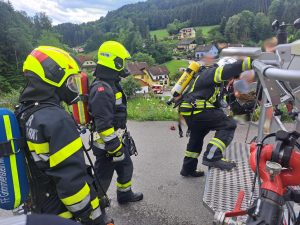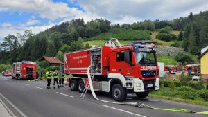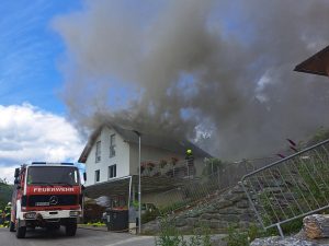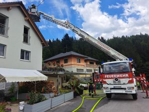 Kurz vor 14 Uhr wurden wir am heutigen Dienstag (16.07.2024) mit 11 weiteren Feuerwehren zu einem Brandeinsatz der Alarmstufe 3 nach Thomasberg alarmiert. Beim Eintreffen am Einsatzort stand der Dachstuhl eines Wohnhauses in Brand. Nachdem sich der Einsatzleiter einen Überblick über die Lage verschaffte wurden die anrückenden Tanklöschfahrzeuge taktisch in Stellung gebracht. Weiters wurde ein Innen – sowie Aussenangriff mit mehreren Rohren gestartet. Dem ersten Atemschutztrupp schlugen im inneren des Dachbodens bereits die Flammen entgegen. Um von aussen effektiver die Brandbekämpfung durchführen zu können, wurde zudem das Hubrettungsgerät der FF Neunkirchen Stadt nachalarmiert. Der intensive Angriff zeigte rasch Wirkung und eine Durchzündung konnte verhindert werden. Trotzdem ist der Schaden am Wohnhaus enorm.