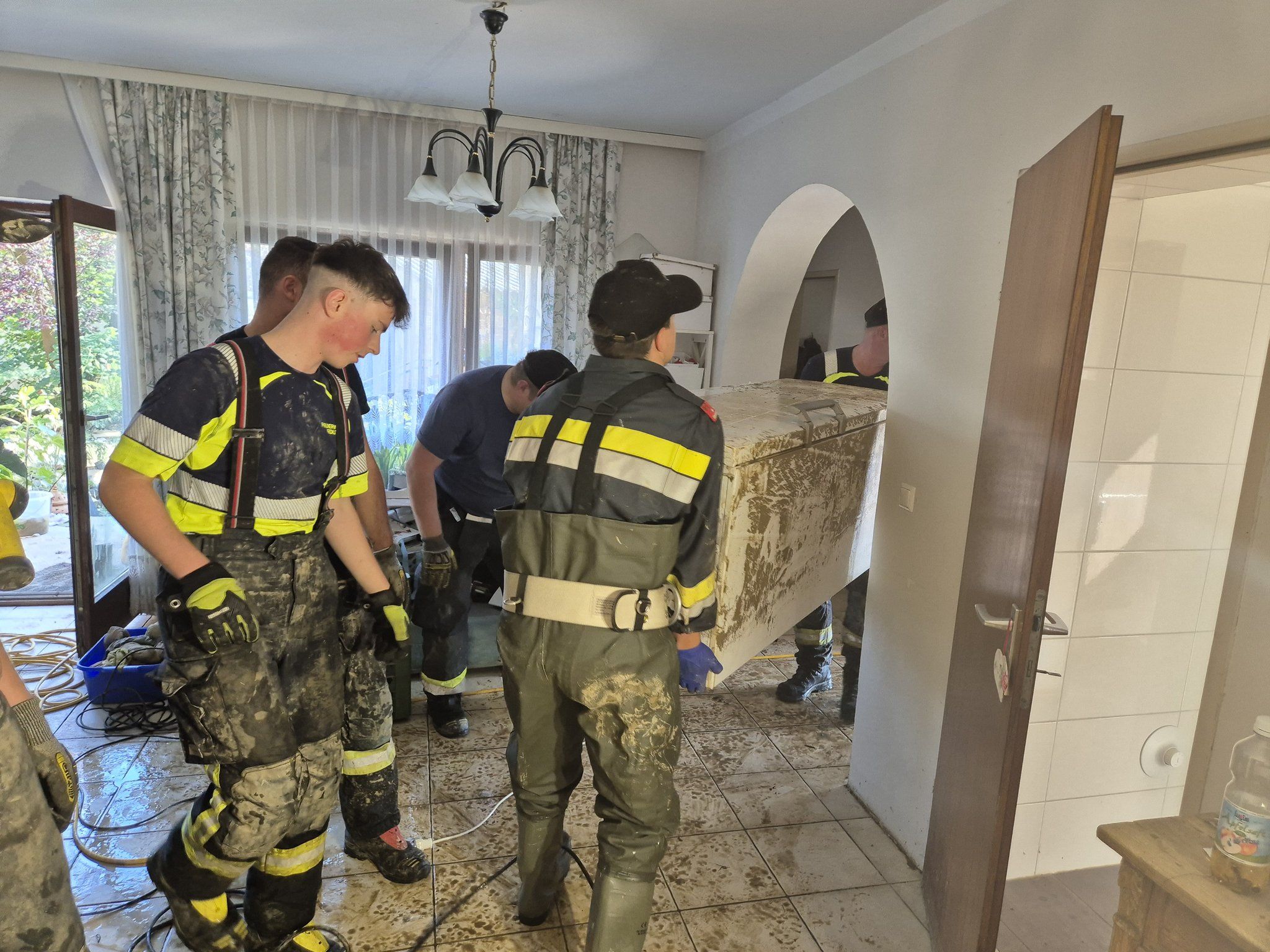 Nach und nach arbeiteten wir eine Einsatzstelle nach der anderen ab. Bei einem Haus galt es einen im Keller befindlichen Pelletstank auszuräumen, der durch das Wasser um ein 5-faches aufquoll und die Statik des Hauses gefährdete. Gemeinsam mit Kameraden der Feuerwehren Feistritz am Wechsel und Zöbern trugen wir Box für Box nach draussen und füllten so insgesamt 15 Big Bags mit den zerfallenen und mit Wasser aufgesaugten Pellets Spänen. Weiters galt es mehrere Kühlschränke und Gefriertruhen zu bergen, welche bereits seit 5 Tagen ohne Strom im überfluteten Keller schwommen. Eine Arbeit, die dem einen oder anderen den Magen umdreht, aber trotzdem geschah sie, um den Menschenvor Ort zu helfen.