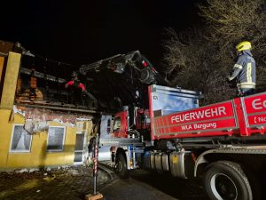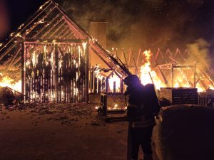 Nachdem der Brand unter Kontrolle gebracht werden konnte, wurde unser WLF mit dem Schalengreifer und der Blochzange nachgefordert, um die Strohballen sowie Teile der Dachkonstruktion zu entfernen. Gegen 6 Uhr Früh konnten wir ins Feuerwehrhaus einrücken und die Fahrzeuge wieder Einsatzbereit machen. Insgesamt standen bei diesem Großbrand 7 Feuerwehren mit rund 80 Mitgliedern im Einsatz. Wir bedanken uns bei allen benachbarten Feuerwehren für die perfekt funktionierende Zusammenarbeit!
