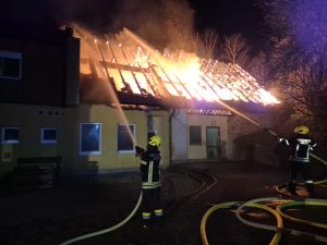 Unsere beiden wasserführenden Fahrzeuge wurden aufgrund der schnellen Eintreffzeit taktisch an vorderster Front in Stellung gebracht. Da sich der Brand auf angrenzende Gebäudeteile sowie dem Wohntrakt auszubreiten drohte, wurde von zwei Seiten eine Riegelstellung errichtet. Im letzten Moment konnte ein Übergreifen verhindert werden. Nach und nach trafen weitere Feuerwehren ein, welche zum einem beim Löschangriff unterstützten, zum anderen für die Löschwasserförderung eingesetzt wurden.