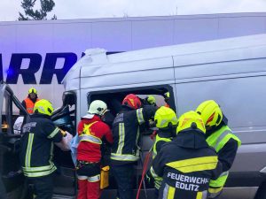 Acht zum Teil massiv eingeklemmte Personen im Inneren des Kleinbusses. Trotz der Tragik am Unfallort funktionierte das Zusammenspiel aller eingesetzten Kräfte auf Anhieb perfekt. Sowohl von der Fahrer, als auch von der Beifahrerseite wurde mit insgesamt vier hydraulischen Rettungsgeräten zeitgleich von den Feuerwehren Pitten und Edlitz an der Rettung der schwerverletzten gearbeitet. Vier der acht Insassen waren zum Zeitpunkt der Erstphase bereits verstorben. In enger Absprache mit dem Notarzt wurden die Insassen nach und nach befreit. Eine enorme psychische Belastung für die Einsatzkräfte, da teilweise über tote Körper gekrochen werden musste, um die Verletzten selbst zu befreien, so Einsatzleiter Peter Luef von der FF Pitten, welcher selbst nach jahrelanger Angehörigkeit der Feuerwehr sowas noch nicht erlebt hat.