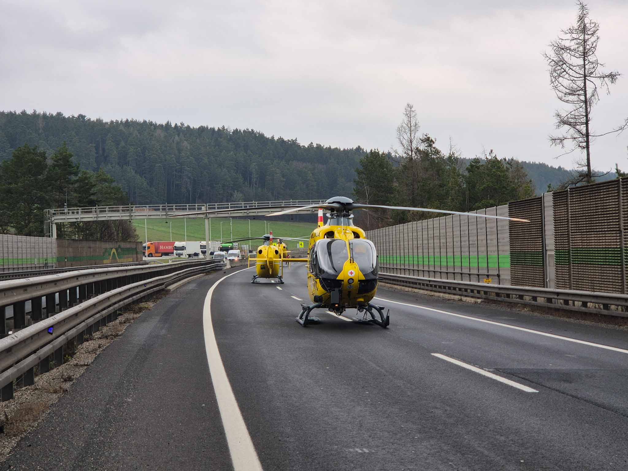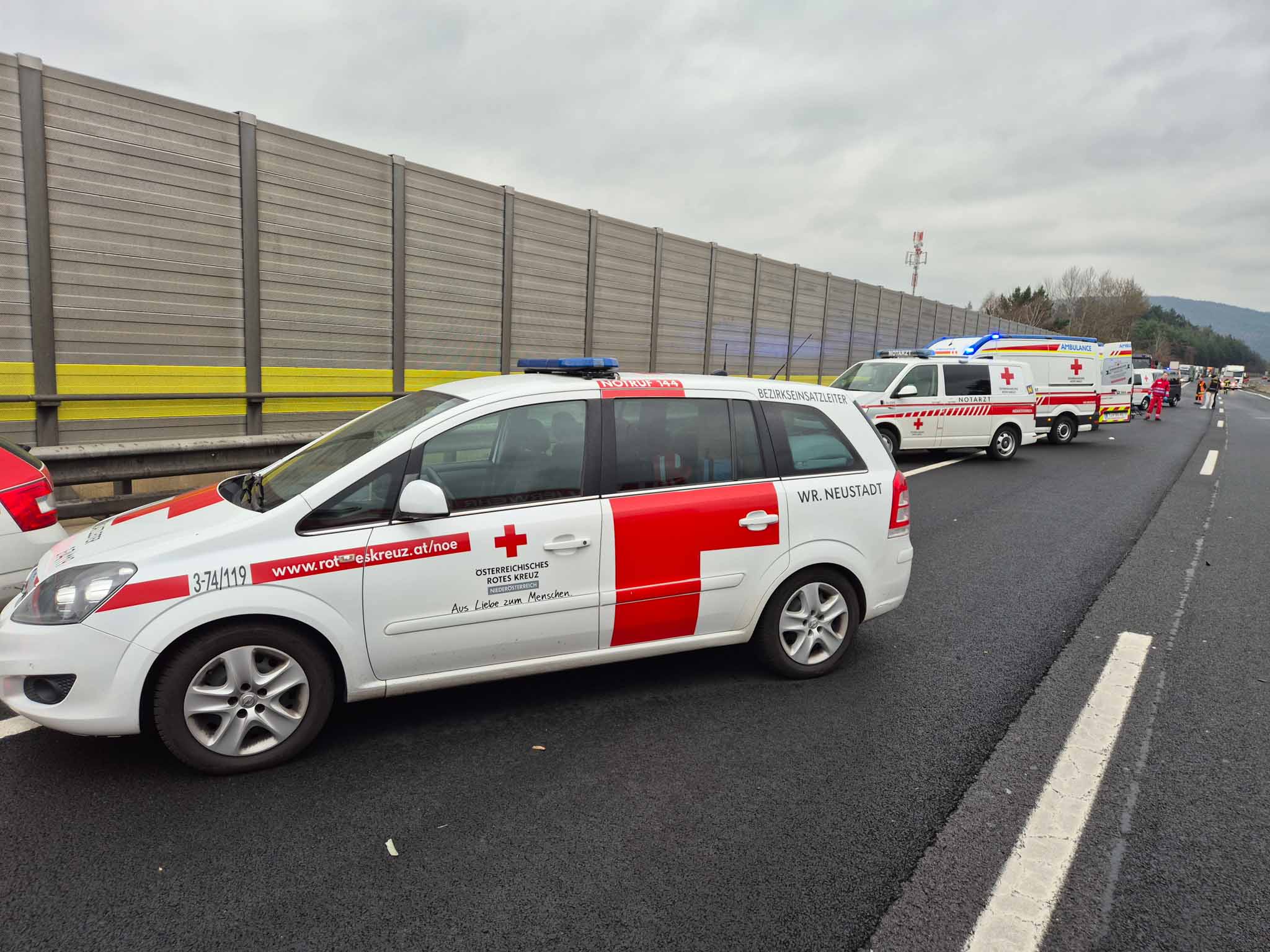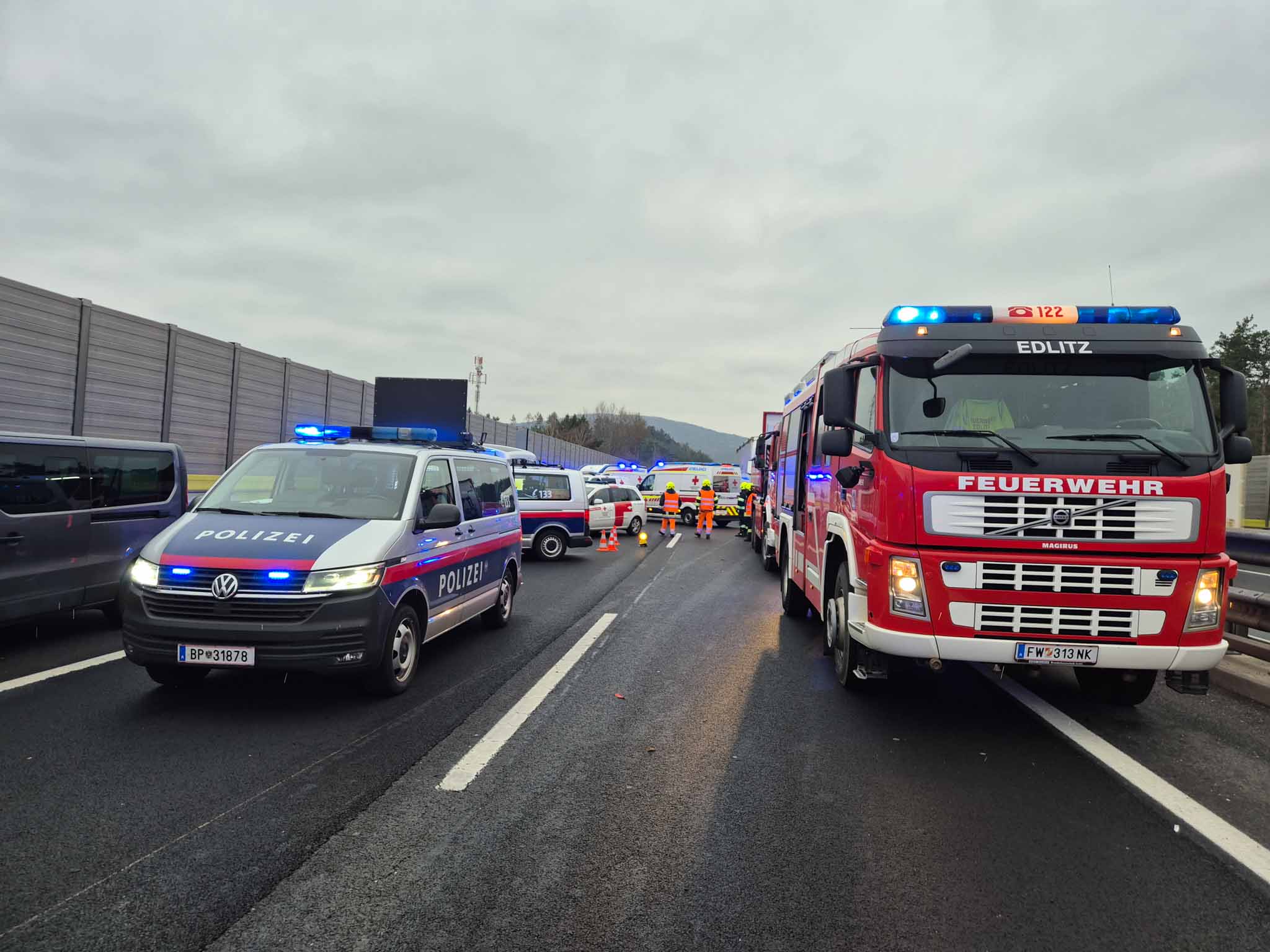 Neben den beiden Feuerwehren standen drei Notarzthubschrauber sowie mehrere Rettungs und Notarztwägen im Einsatz. Die vier Schwerverletzten wurde in umliegende Krankenhäuser gebracht. Die beiden Lkw Fahrer kamen mit leichten Verletzungen davon. Für die Vermessung der Unfallstelle wurde von der Polizei eine Drohne eingesetzt. Nach Abschluss der Erhebungen wurde die Unfallstelle von den Feuerwehren Pitten und Edlitz, gemeinsam mit der ASFINAG und einer Bergefachfirma geräumt. Ebenso stand eine Hochdruckkehrmaschine für die Fahrbahnreinigung im Einsatz. Der Verkehr wurde bei Grimmenstein abgeleitet und über die B54 umgeleitet, was zu einem Verkehrschaos auf der Ausweichstrecke führte. Nach rund 3,5 Stunden konnte die Unfallstelle freigegeben werden. Die Unfallursache wird von der Polizei ermittelt.
