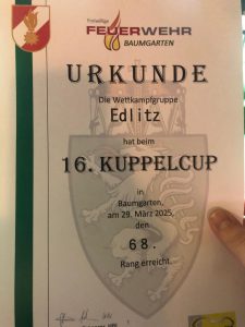 Letzten Samstag (29.03.2025) nahm die Wettkampfgruppe der Feuerwehr Edlitz erneut am Kuppelcup der Freiwilligen Feuerwehr Baumgarten teil. Bei einem dichten Starterfeld aus den Bundesländern Niederösterreich, Burgenland und Steiermark konnte die Bewerbsgruppe der FF-Edlitz den 68. Platz von rund 90 Bewerbsgruppen erreichen.