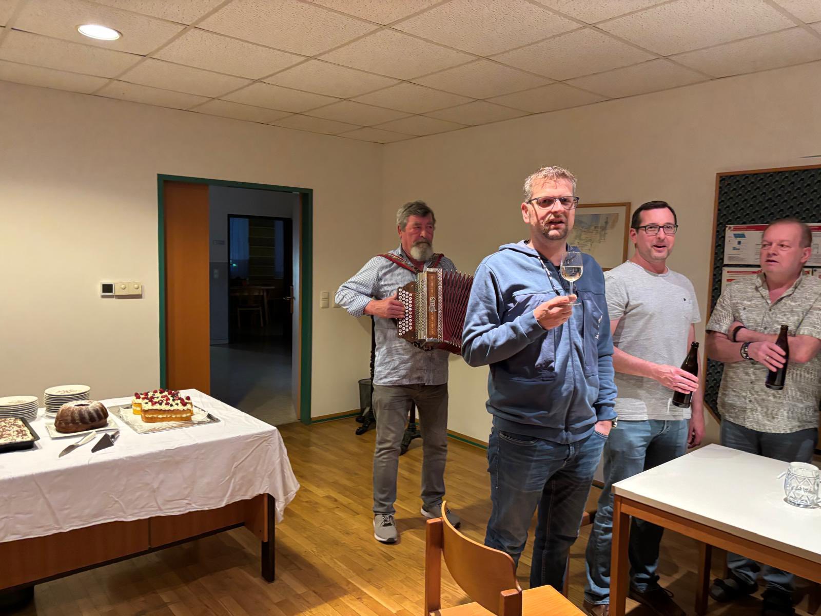 Nach dem Fahrzeugbrand am Nachmittag (11.04.2025) fand am Abend eine erweiterte Chargensitzung über anstehende Termine sowie allgemeines der Feuerwehr statt. Im Anschluss an die Sitzung wurde gemeinsam die 40er-Feier von drei Kameraden gefeiert. (Patrik Lechner, Christoph Peinthor und Christian Rodax).