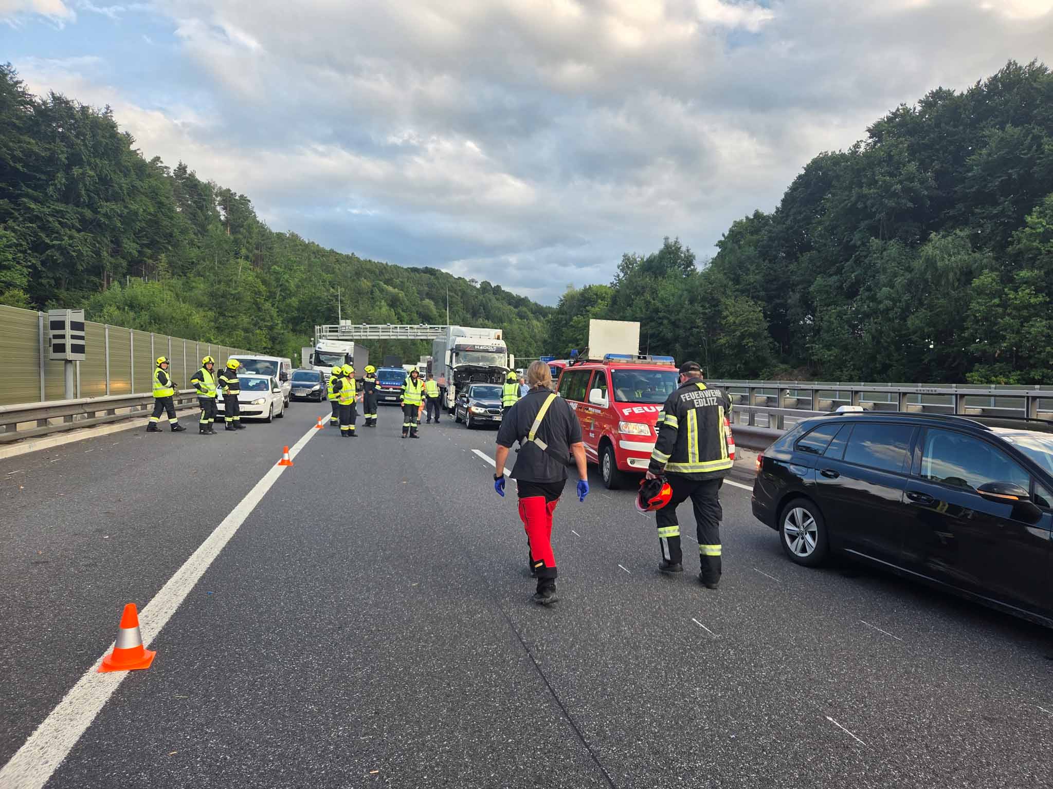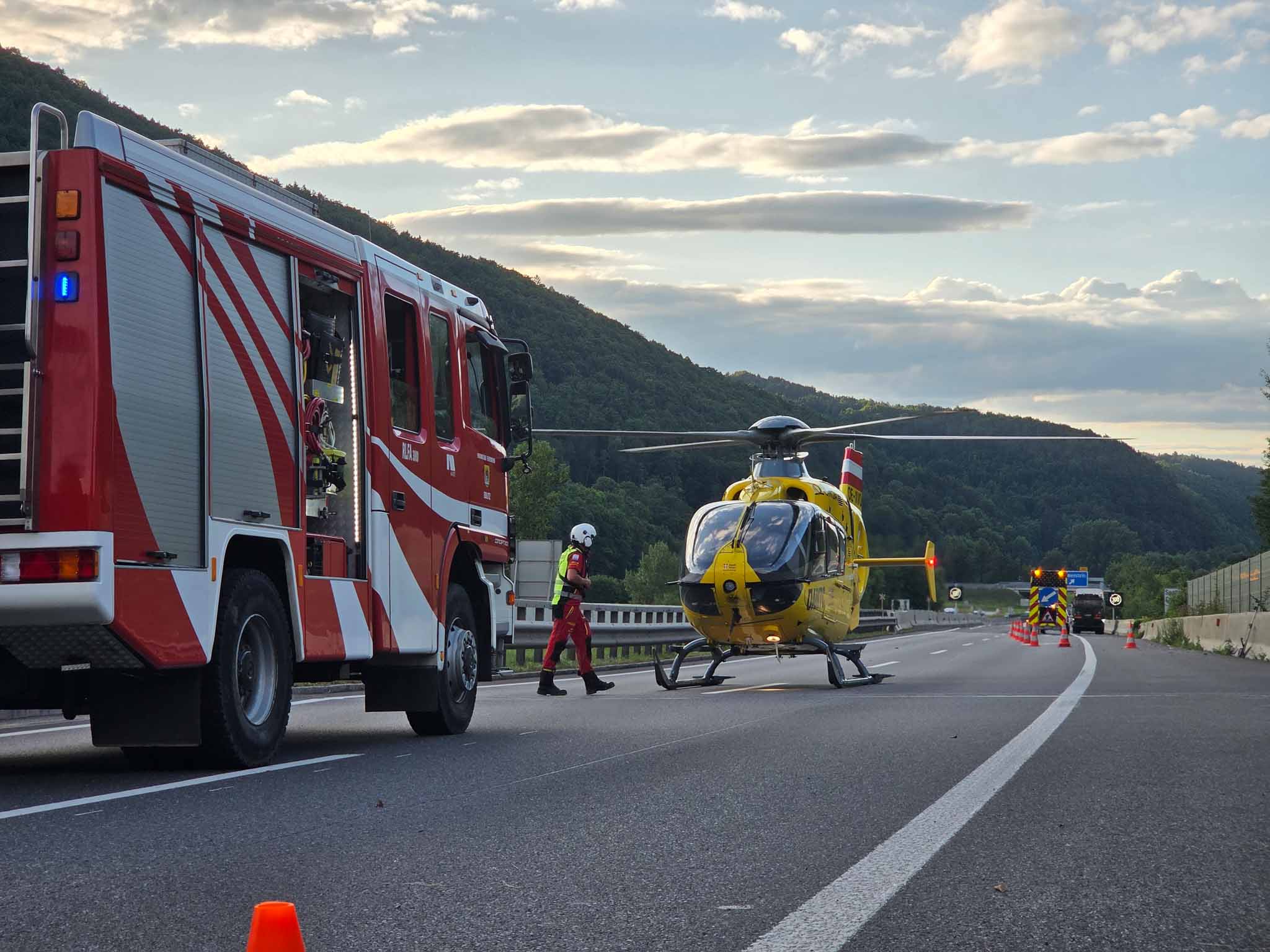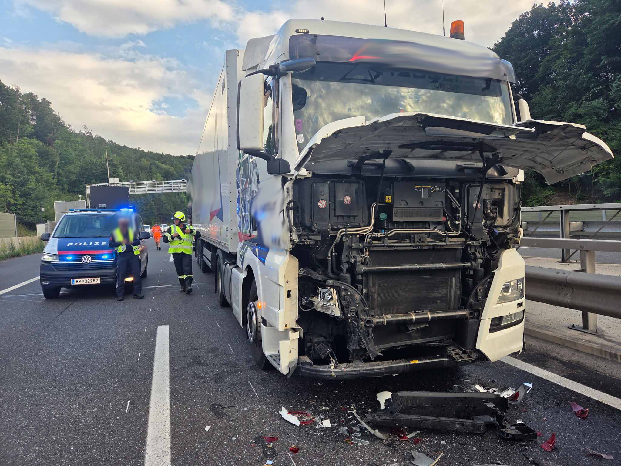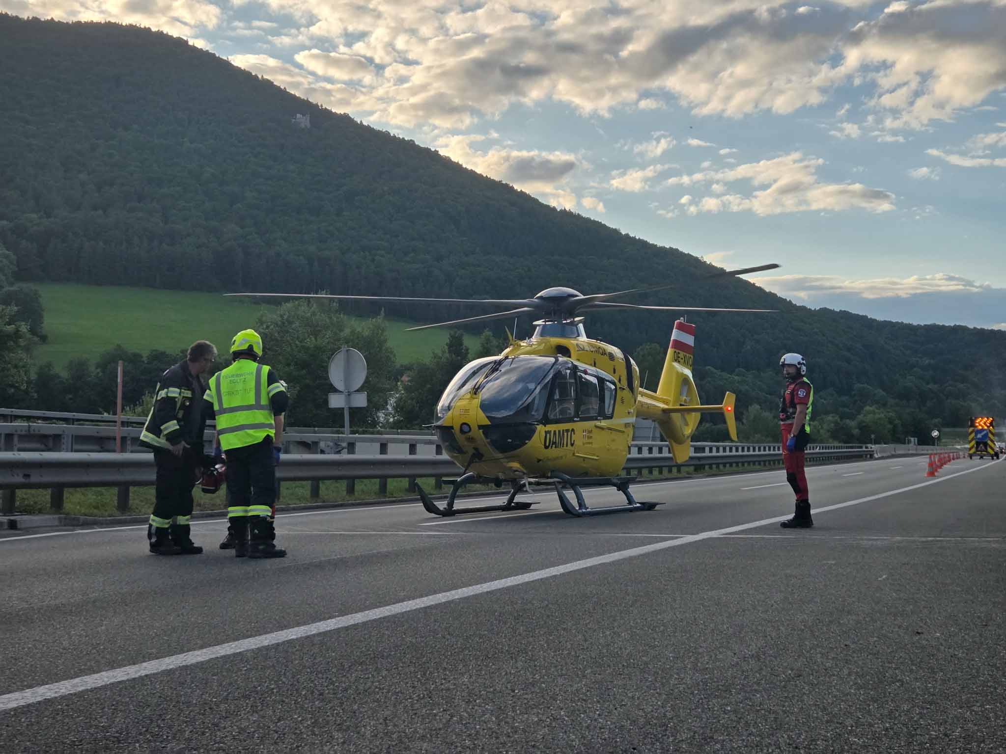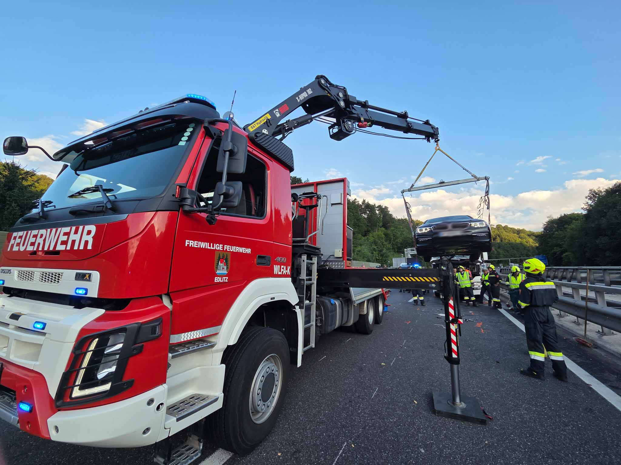 Abermals Menschenrettung. Lkw gegen Pkw auf der A2 Richtung Wien bei km. 67. Unverzüglich rückten die drei am heimweg befindlichen Fahrzeuge auf die A2 aus. Weiters wurde das TLF und das WLF in Marsch gesetzt, um auf der A2 zu unterstützen. Vor Ort bot sich sich uns folgendes Bild: Ein Sattelzug dürfte das Stauende einer Tagesbaustelle übersehen haben und krachte auf das Heck eines Pkw. Glücklicherweise erlitten die beiden Pkw Insassen nur leichte Verletzungen und waren bereits aus dem Fahrzeug. Der Lkw Lenker blieb unverletzt. Aufgrund der Alarmierung wurde auch der Notarzthubschrauber C9 aus Wien alarmiert, welcher auf der A2 landete. Hierfür musste die A2 Richtung Wien gesperrt werden. Nachdem die Polizei die Unfallstelle freigab wurde von uns der schwer beschädigte Pkw mittels Kran des WLF geborgen und von der A2 verbracht. Weiters wurde die Fahrbahn gereinigt und ausgelaufene Betriebsmittel gebunden. Nach rund 2 Stunden konnte die Einsatzbereitschaft wieder hergestellt werden. Wir bedanken uns bei allen beteiligten Blaulichtorganisationen für die gute Zusammenarbeit.