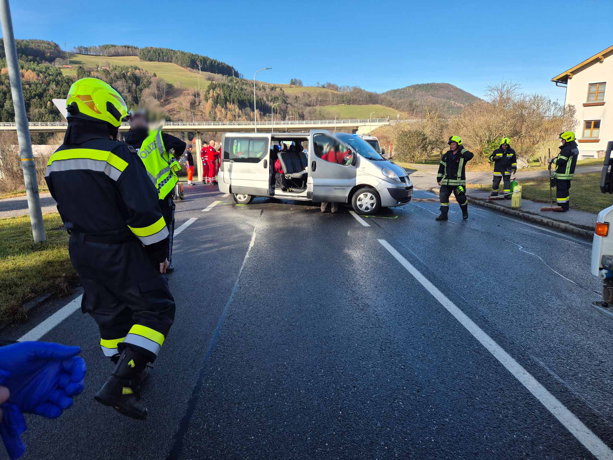 Zu einem schweren Verkehrsunfall ist es am Dienstag (09.12.2025) um die Mittagszeit auf der B55 im Bereich Autobahnauffahrt Edlitz gekommen. Aus noch unbekannter Ursache kam es zu einem seitlich / frontal Zusammenstoß zwischen einem Pkw und einem Kleinbus. Um 12:03 Uhr wurde die FF Edlitz mittels Sirenenalarm zu einem Verkehrsunfall der Alarmstufe 2, mit dem Zusatz unklare Lage alarmiert. Drei Minuten nach der Alarmierung rücken das RLFA sowie das Vorausfahrzeug zur Unfallstelle aus.