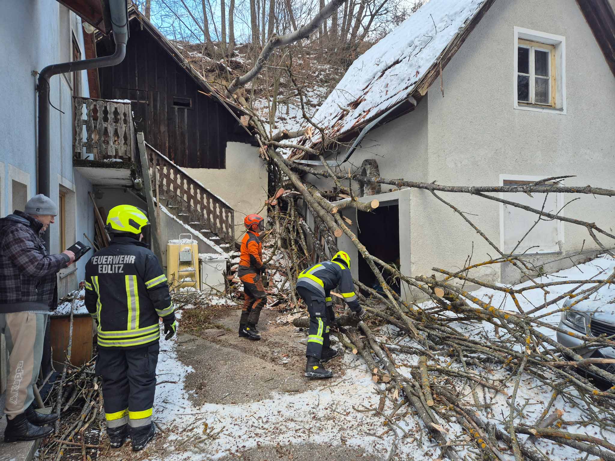 Der letzte Einsatz im Jahr 2025 führte uns am 31.12.2025 ins Ortsgebiet von Edlitz. Ein Baum ist auf ein Gebäude gestürzt, und hat das Dach teilweise beschädigt. Wie durch ein Wunder befand sich zum Zeitpunkt des umstürzen niemand im Gefahrenbereich. Zudem wurden zwei geparkte Fahrzeuge durch den Baum beschädigt. Von uns wurde der Baum zerkleinert und lose Äste vom Dachbereich entfernt.