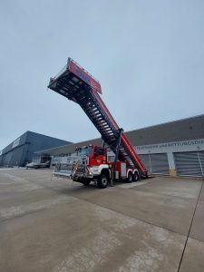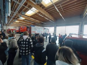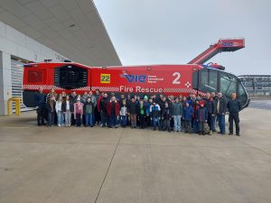 Wir durften die aktuellen Einsatzfahrzeuge aus nächster Nähe anschauen und bekamen sogar die Rettungstreppe aufgebaut. In rund 8 Metern Höhe konnten wir einen kleinen Überblick über das Flughafengelände genießen.