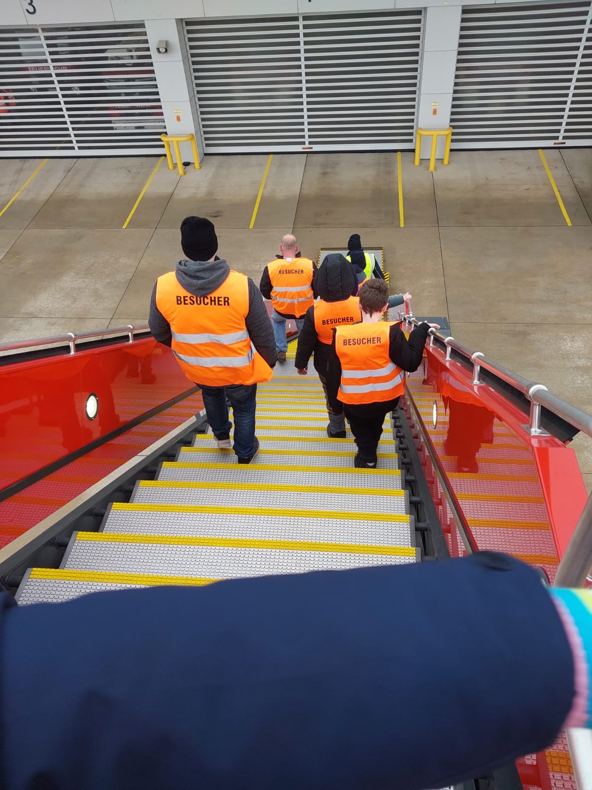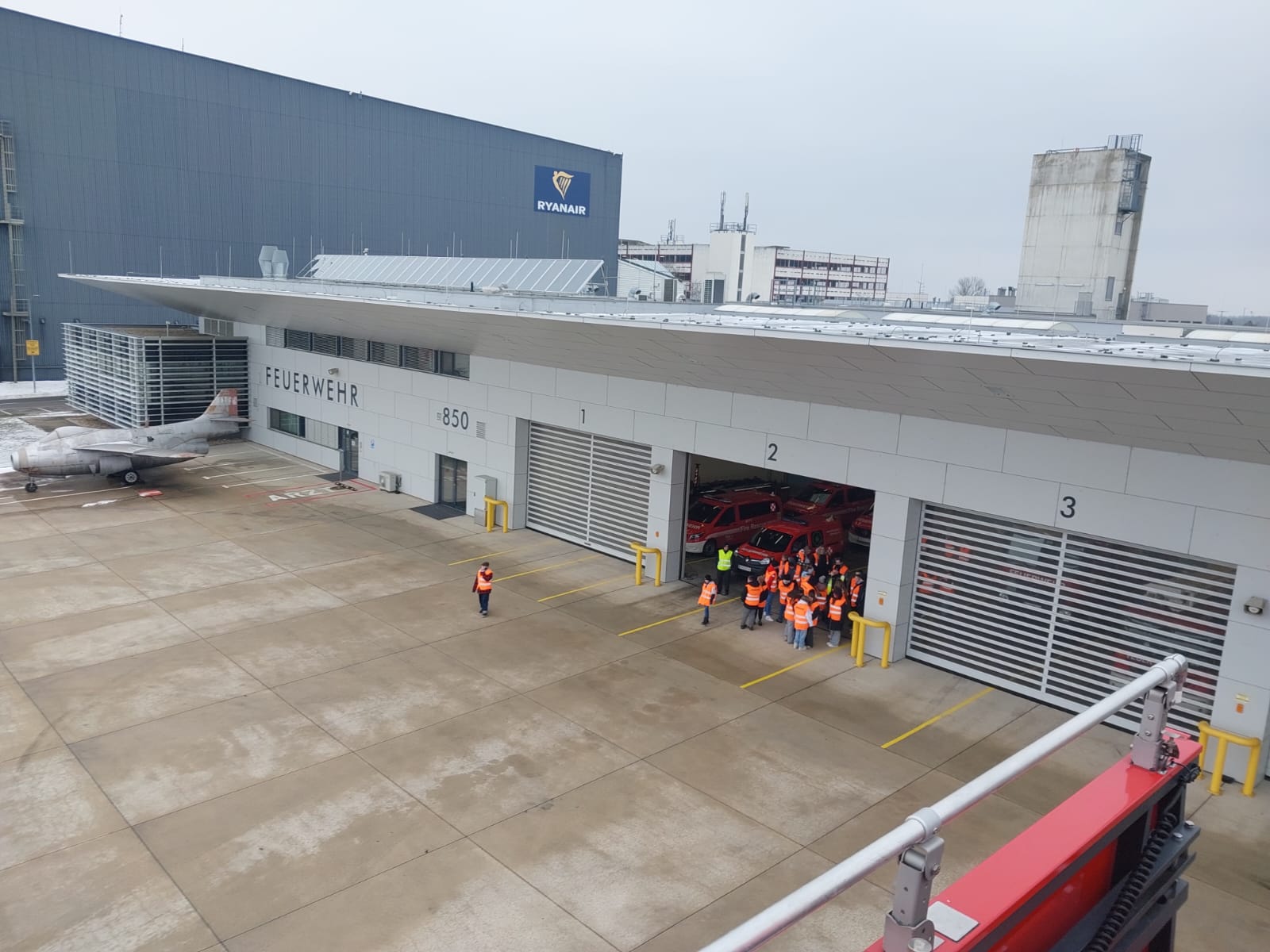 Wir durften die aktuellen Einsatzfahrzeuge aus nächster Nähe anschauen und bekamen sogar die Rettungstreppe aufgebaut. In rund 8 Metern Höhe konnten wir einen kleinen Überblick über das Flughafengelände genießen.