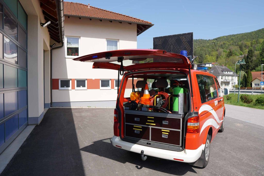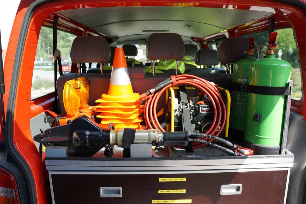 Ausstattung: Verkehrsleiteinrichtung, Blaulichtbalken mit Rot und Grünlicht, Hydraulisches Kombirettungsgerät, Gurtmesser, 2 Bioversallöscher, 1Pullverlöscher, 8 Verkehrsleitkegeln, 2 Weitwarnblinkleuchten, 2 Triopan Faltsignal, 2 Anhaltestäbe, Arbeitshandschuhe, Starterkabel, Abschleppseil, Löschdecke, Sanitätsrucksack, Werkzeugkoffer, Wolldecke, Decken, Handfunkgerät,  Einsatzkoffer, Tisch für Einsatzleitung, 4 Stk. Warnwesten Feuerwehr Edlitz, 3 Handscheinwerfer, Digitalkamera, Handy, Div.Schlüssel(Betriebsumkehr A2, Firma List usw.)